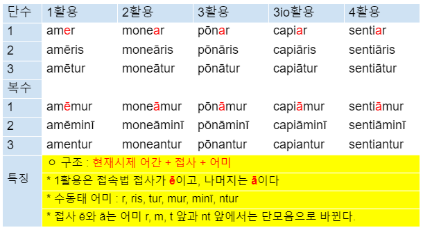 ☞ 접속법 미완료 능동과 수동은 모든 변화에서 연결모음 ā, ē, e, e, ī가 온전히 유지된다.